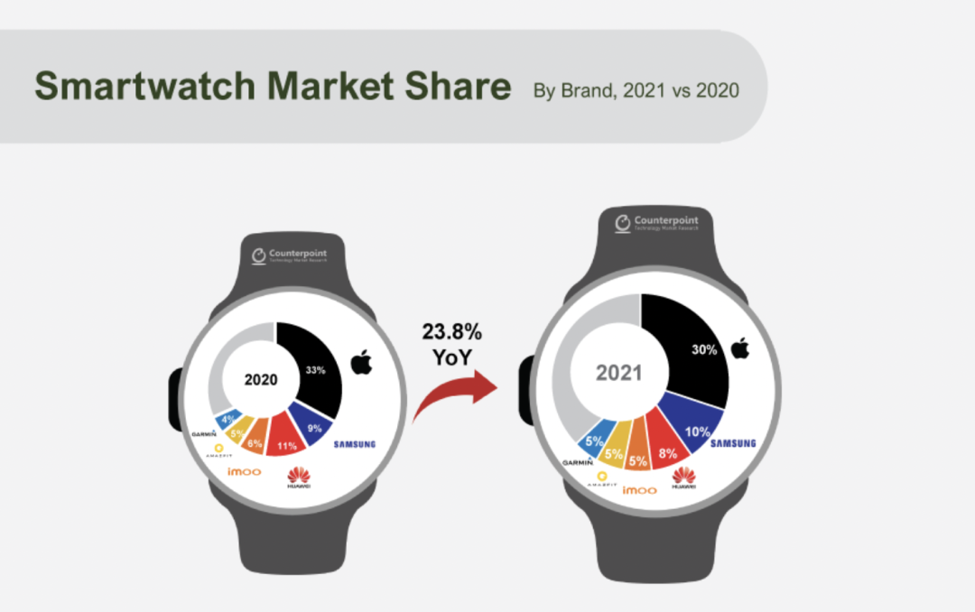 - 尽管 Apple Watch 7 系列的发布被推迟到第四季度,但三星在 2021 年成功推出了 Galaxy Watch 4 系列,然后提升了其商场位置。