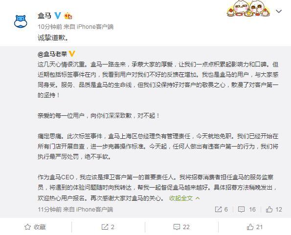 痛定思痛。此次标签事情,盒立刻海区总经理负有办理职责,今日就地免职。咱们现已开端在所有门店展开自查,进一步完善操作规范。今日起,任何人做出有违客户榜首的行为,咱们将履行最严峻处分,绝不手软。 作为盒马CEO,我应该是保卫客户榜首的首要职责人。我将招募顾客担任盒马的服务监察员,将遇到的体会问题随时向我传达,帮我一同催促盒马越来越好。详细招募办法稍晚宣布,欢迎热心用户报名。再次感谢咱们对盒马的关怀。