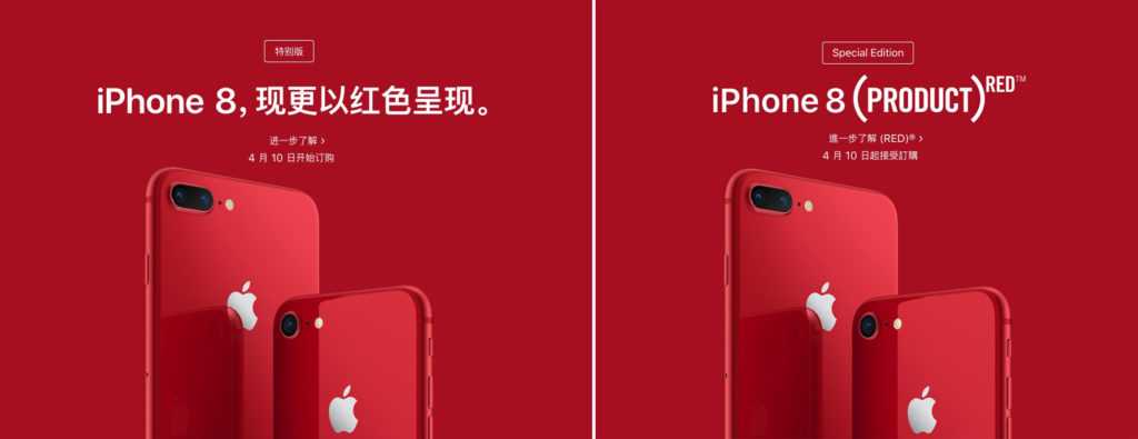 苹果的赤色版系列产品来自与 (PRODUCT)RED 的协作,后者是一个认为国际防治艾滋病、结核病和疟疾筹款的非盈利安排。在中国大陆官网(上图左)上的赤色版 iPhone 并没有标明 (PRODUCT)RED 的标志,与之相对的,苹果在香港官网(上图右)的介绍里还特别给出介绍